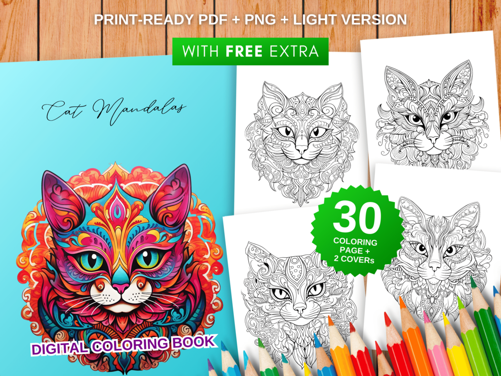 Libro para colorear mandalas de gato: 30 páginas para colorear para niños y adultos, imprimible PDF + PNG, Descarga Instantánea