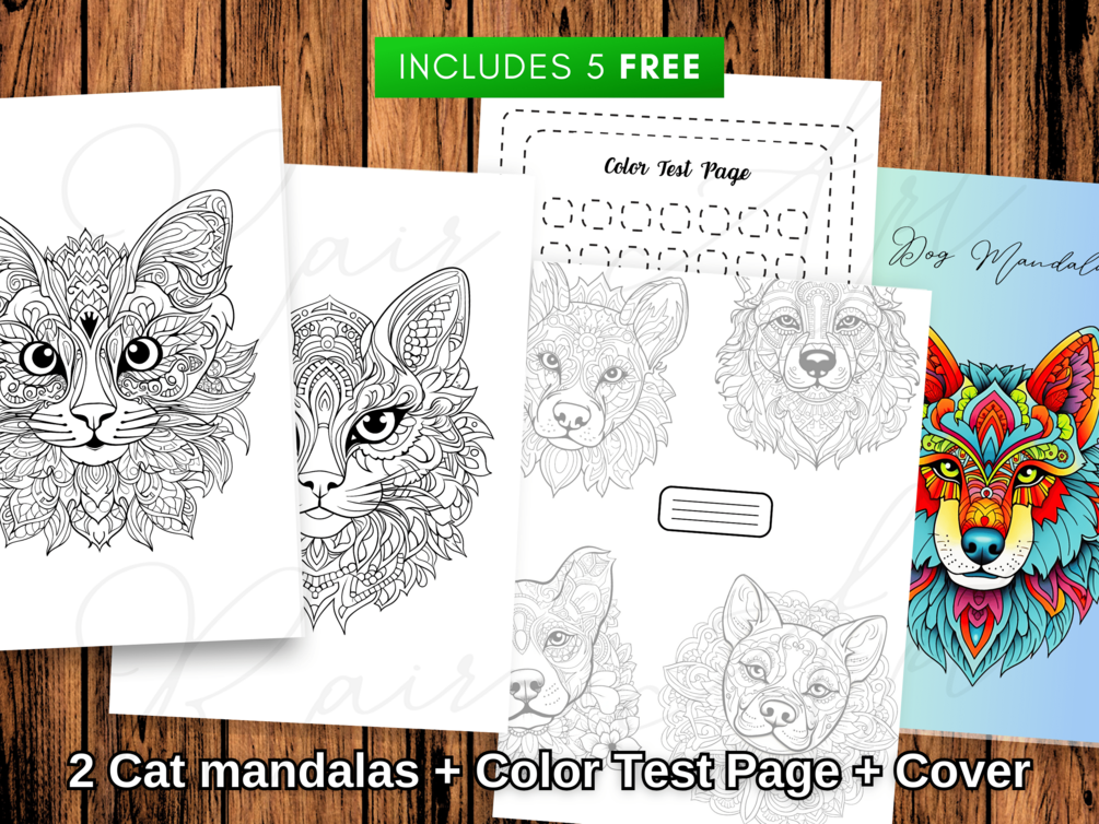- 5 Páginas extra: 1 portada, página test de colores, 2 mandalas de gatos y página para escribir tu nombre.