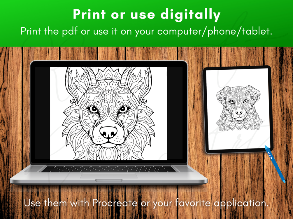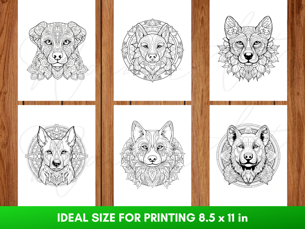 Libro para colorear mandalas de perros: 30 páginas para colorear para niños y adultos, imprimible PDF + PNG, descarga instantánea