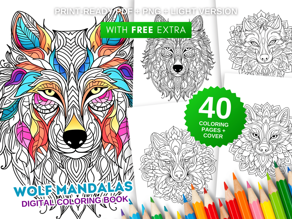 Libro para colorear mandalas de lobos: 40 páginas para colorear para niños y adultos, imprimible PDF + PNG, descarga instantánea
