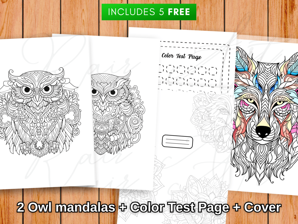 • 5 Páginas extra: 1 portada, página test de colores, 2 mandalas de búhos y página para escribir tu nombre.